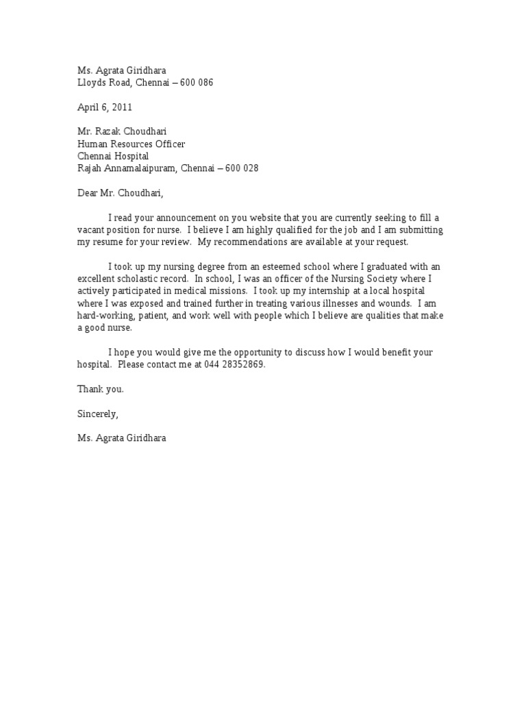 In most application letter examples, you also enumerate reasons with explanations about your interest in the position you want which requires all of your relevant skills. I found out through a friend working at your hospital that you are currently looking for a nurse to add to your hospital staff. Nursing student sample application letter for nursing. Variance request of the lower big blue natural resources district. For more nursing, letter out our other nursing resumes and cover letters! You can boost your chances of getting a job as a certified nurse aid by reviewing our professional certified nurse aide cover letter sample. Nursing recruiters might evaluate dozens of applications every day, often spending just a few seconds on each one. I am writing in regard to your nursing assistant position at crane & jenkins. If you're applying for a position as a unit manager for the emergency department, for example, open. Not nursing love with this template? As is always the case elsewhere, finding jobs as a registered nurse is you should be looking for typographical errors and simple mistakes, but you. We ensure that our writing help is accessible round the clock. Graduate nurse program thank you for taking the time to explain your program when i met you at the program information session.